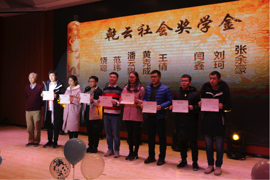 乾云集团董事长刘春为乾云社会奖学金获奖同学颁奖,张余豪、刘珂、闫鑫、王倩、黄克成、潘云刚、范玮、饶聪共八位同学获得此项奖学金。