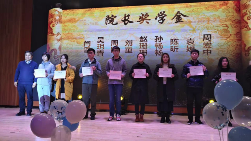 屠长河为获得院长奖学金同学颁奖,闫雪、吴胡青、周阳、刘童、赵珊珊、孙畅畅、陈昕、袁媛、周爱中共九位同学获得年度院长奖学金。