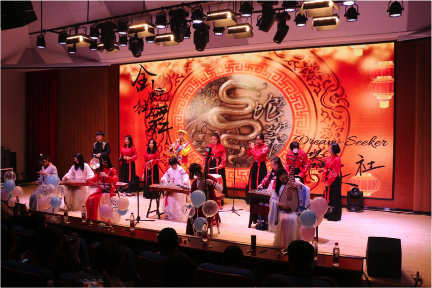 晚会伊始,《金蛇狂舞》一场精湛乐器表演震撼开场,顺利拉开晚会帷幕。随后贾智平发表致辞,预祝晚会圆满举行,祝愿同学们新年快乐、学业有成。