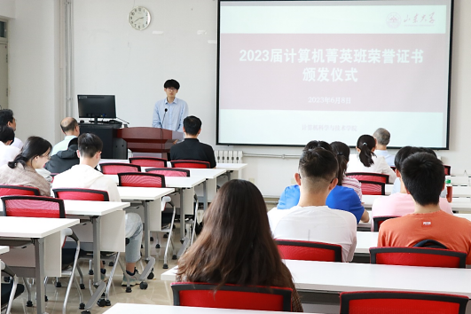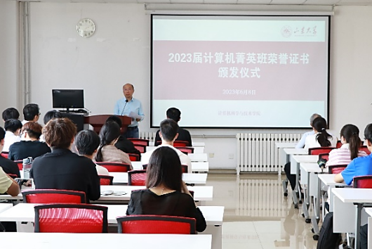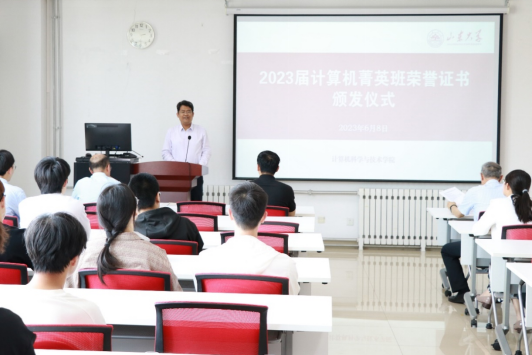 6月8日下午,计算机菁英班举办2023届荣誉证书颁发仪式,计算机科学与技术学院党委书记贾智平教授、副院长彭朝晖教授、党委副书记张四化副教授、菁英班指导委员会教授代表崔学峰教授、院长助理赵梦莹教授、辅导员惠雪老师、教学秘书赵徐铭老师以及菁英班的全体同学参加仪式,仪式由彭朝晖副院长主持。
