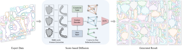 第3篇文章研究平面不规则形状的排列问题(图3)。这是经典的教科书问题,不存在多项式复杂度的解法。研究团队发现,基于得分匹配的扩散网络模型能够从专家样本中直接学到密铺排列的全局最优分布,于是通过多层图神经网络生成适用于排样问题的梯度场,以指导每个物体的具体位移。该算法不仅对物体的数量、物体的形状、限制区域的大小具有较强的扩展能力,而且计算效率远高于传统算法,因而在物流、仓储、3D打印、游戏设计等实际场合具有较大的应用价值。本文被录用为Conference track,由山东大学薛天扬同学与北京大学吴铭东同学共同完成,通讯作者为山东大学吕琳教授。合作指导教师还包括北京大学董豪助理教授、陈宝权教授。山东大学本科生王浩轩(第四作者)也参与了该项研究工作。