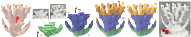 第2篇文章研究增减材混合制造序列规划问题(图2)。增材-减材混合制造(Additive and Subtractive Hybrid Manufacturing, ASHM)作为新型制造工艺,兼具两种先进制造工艺的优势,特别适用于形状复杂、加工质量要求较高的场合。为此,寻找增材与减材切换次数最少的混合加工方案,成为其中的基础研究课题。其挑战性在于不仅需要考虑刀具和打印喷头的可达性,还需要考虑制造区域的前后依赖关系和自支撑性。研究团队将增材和减材的次序规划描述为体积与表面共分解(Volume and Surface Co-Decomposition, VASCO)问题,从而提出基于集束搜索的块分解算法,以自顶向下的方式为VASCO问题提供了一个高效的解决方案。在五轴增减混合制造平台上的加工实验表明,该方法为增减材混合制造序列规划问题提供了一种智能有效的解决方案。本文被录用为Journal track,第一作者是硕士生钟凡超,通讯作者是赵海森教授和吕琳教授。合作指导教师还包括山东大学刘继凯教授和北京大学陈宝权教授。硕士生李昊晨(第三作者)和闫鑫博士(第四作者)也为本文研究做出了突出贡献。