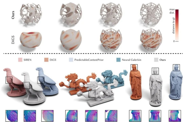 第1篇文章针对缺失法向的点云数据,探索如何基于无监督深度学习重建带细节的三维模型(图1),这也是计算机图形学的热点和前沿研究课题。该课题的挑战在于如何解决低质量三维数据与高要求重建目标之间的矛盾。研究团队观察到限制在曲面薄壳区域中的符号距离函数二阶可微,而且其Hessian矩阵至少有一个零特征值;该性质具有普适性,与曲面的具体形状无关。基于这样的观察,文章使用具有严格理论保证的奇异Hessian能量项代替传统的光滑能量项,提出了全新的符号距离场正则机制。在公开数据集上的广泛测试结果表明,与已有方法相比,本文方法能够更保真地重建拓扑和几何复杂的三维模型,在亏格还原和细节呈现能力方面具有明显的优势。在真实扫描数据上的测试结果表明,该方法在文物数字化保护和数字孪生等方面具有较大的应用潜力。本文被录用为Journal track。五位审稿人均给出了高度评价,他们认为本文极具创新性(novelty),理论优雅(elegance),阐述清晰(well written),实验完善详尽(exhaustivity)。第一作者是硕士生王子雄,通讯作者是辛士庆副教授。合作指导教师还包括山东大学屠长河教授、美国德州农工大学王文平教授、北京大学王鹏帅助理教授、山东工商学院张帆副教授和青岛科技大学的陈双敏副教授。硕士生张云霄(第二作者)和徐瑞(第三作者)也为本文研究做出了突出贡献。