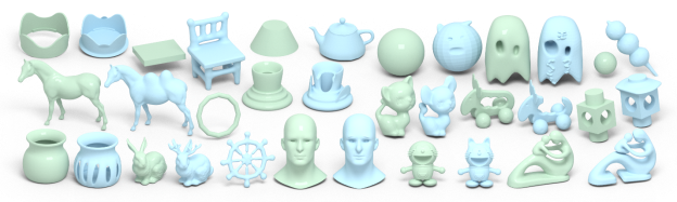 图1.与已有方法相比,我们的方法(灰色显示)在重建拓扑/几何复杂的三维模型方面具有明显的优势