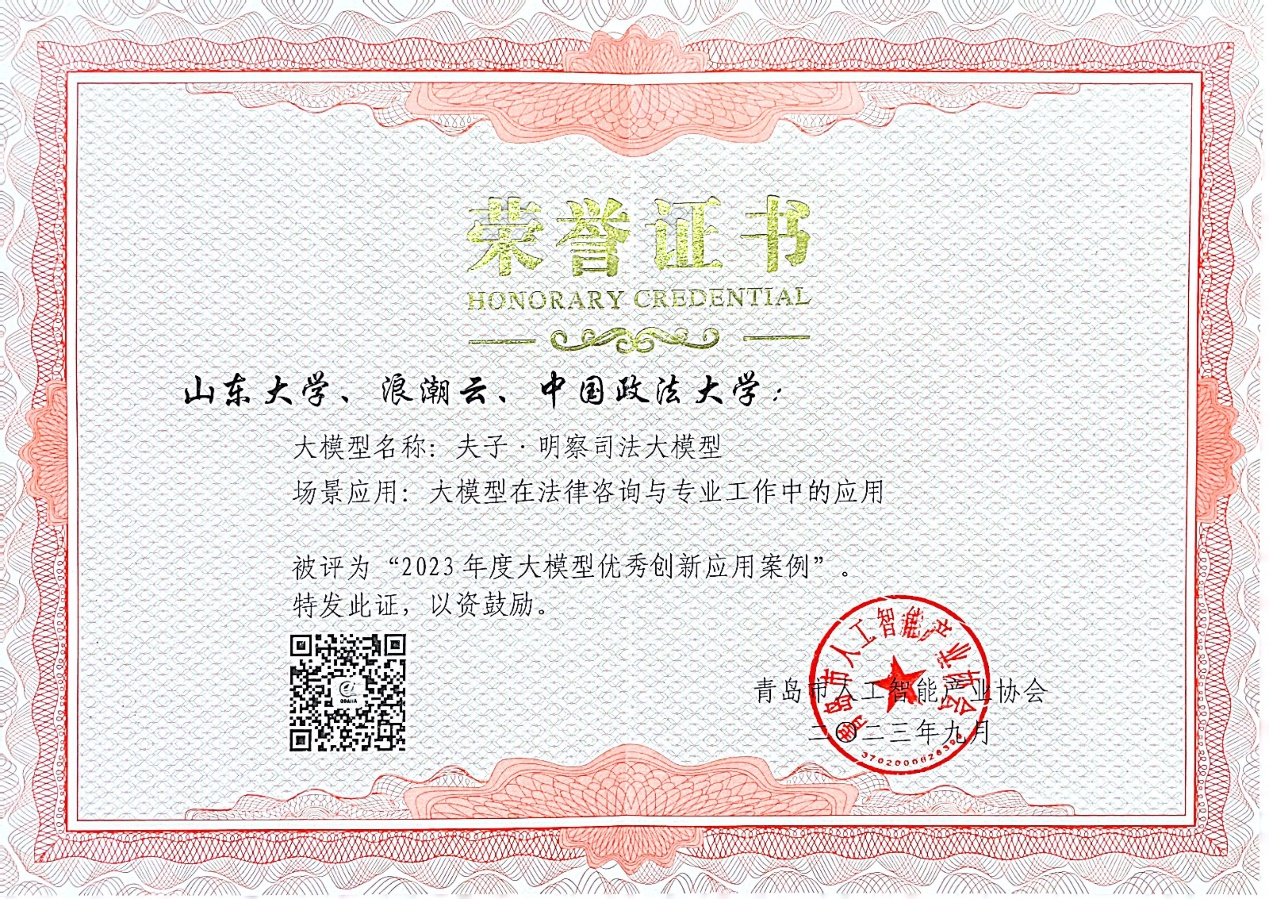 夫子•明察司法大模型获评“2023年度大模型优秀创新应用案例”