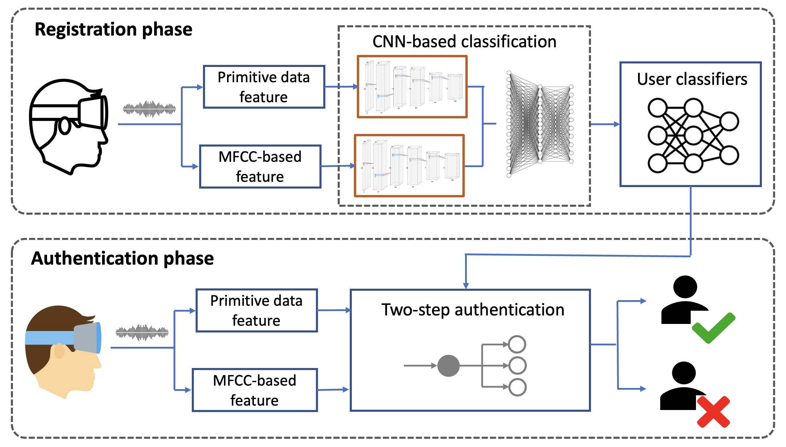 《VibHead: An Authentication Scheme for Smart Headsets through Vibration》发表于CCF B类期刊《ACM Transactions on Sensor Networks》,作者包括山东大学李峰教授(第一作者)、硕士研究生赵佳艺(学生作者)、于东晓教授、周元峰教授、沈益冉教授(通讯作者)等。当前智能头戴设备的身份认证机制面临操作复杂、依赖于特殊装置等一系列问题。该项工作首次提出了一种基于振动的智能头戴设备身份验证方案VibHead。由于震动信号在不同个体头部传播时呈现出独特的模式,VibHead从震动信号中提取特征,并利用卷积神经网络模型为已注册合法用户构建分类器。依据上述分类器,该工作设计了一个两步骤身份验证方案,以区分合法用户和非法用户。该工作构建了VibHead系统原型,通过大量实验,证明该系统可对用户身份进行毫秒级的准确验证,误通过率和误拒绝率均为5%左右。该工作即将在嵌入式传感网顶级会议ACM Conference on Embedded Networked Sensor Systems (SenSys 2023)上作会议报告。文章链接如下:https://dl.acm.org/doi/abs/10.1145/3614432。