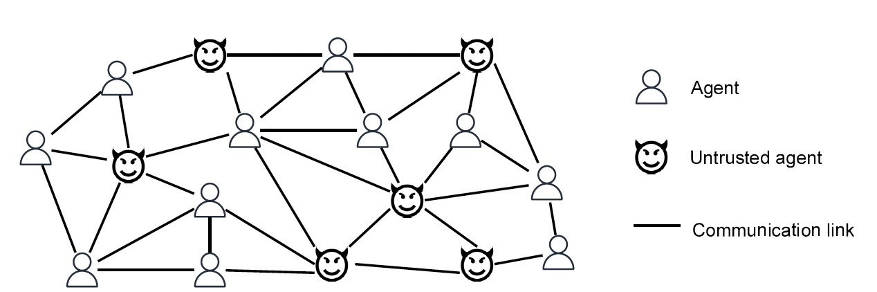 图1 任意一般图中的智能体可以通过相互交换隐私信息进行合作,但是这些智能体的可信任性难以得到保障。某些恶意智能体还可能散布虚假信息,干扰智能体之间的协作。