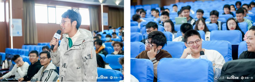 本次活动中,同学们认真听讲、记录并提问,表达了对人文、社会、科技发展中出现或即将出现的各种现象的关注,展现出了极高的综合素质水平。与会师生还就AI原生应用、百度文心大模型及AI创新实践平台、百度人才观等话题进行了深入的交流探讨。