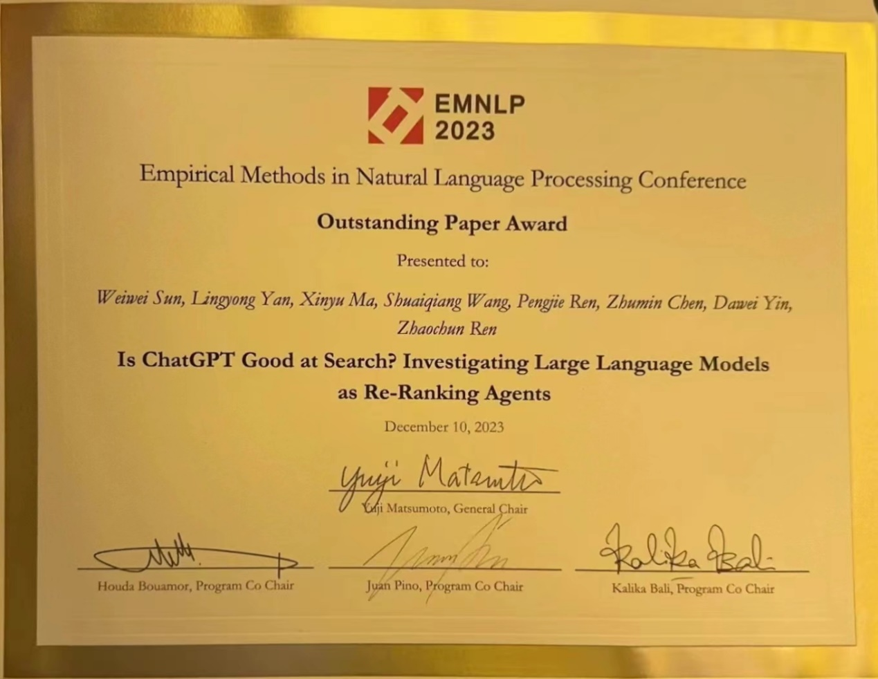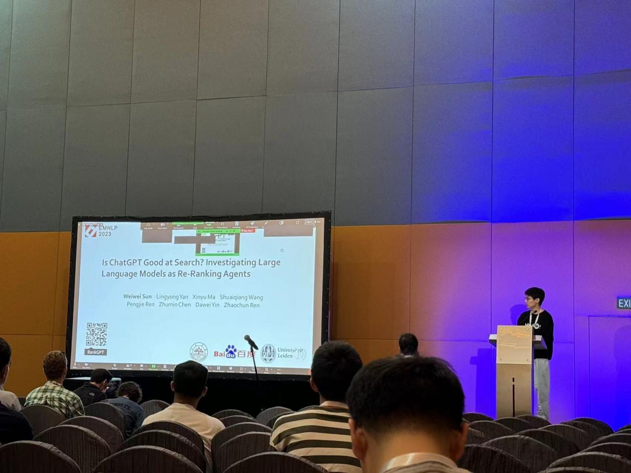 全球自然语言处理领域顶级会议EMNLP2023近日在新加坡召开,山东大学信息检索实验室研究成果“Is ChatGPT Good at Search? Investigating Large Language Modelsas Re-Ranking Agents”获得大会颁发的杰出论文奖(Outstanding Paper Award)。TapTap,TapTap点点2021级硕士生孙维纬为第一作者,百度为合作单位。