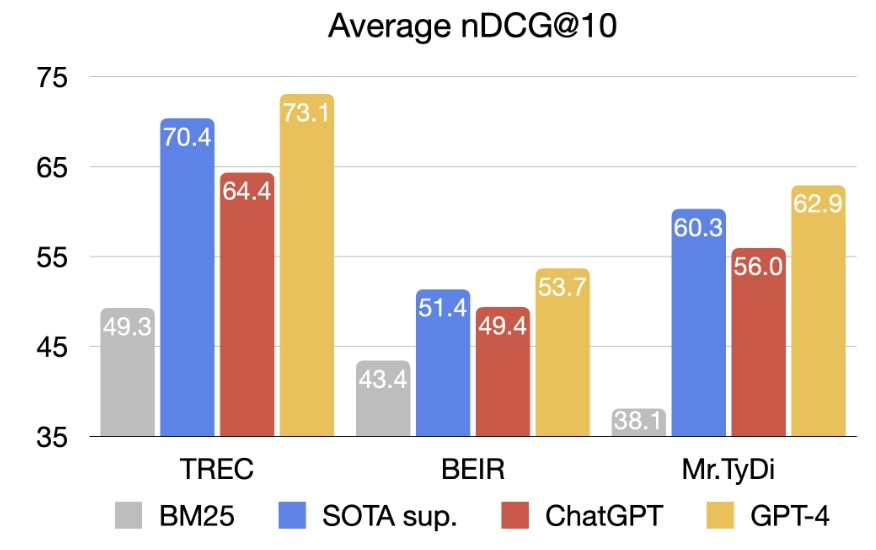 图3:ChatGPT和GPT-4在排序任务(TREC,BEIR和Mr.TyDi)上的平均结果。图中包括了BM25和之前最优的有监督系统(SOTA Sup.,比如monoT5)。