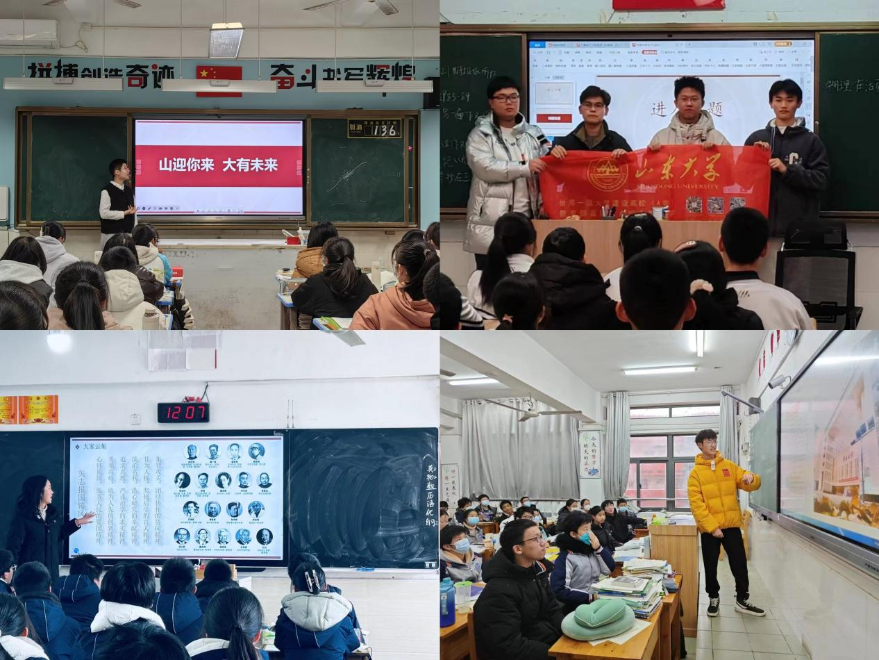 感恩母校行,共筑山大梦。学院学子怀揣着对母校栽培的感恩、对学弟学妹的关怀,回访高中开展了“情系母校宣讲”的社会实践活动。宣讲活动范围广泛,涉及山东、安徽、河南、贵州、河北等十七个省份。宣讲采取“线上和线下”相结合的形式,既有在线上会议和学校大会堂的大范围汇报宣讲,也开展了毕业班级面对面的小范围宣讲答疑。各宣讲团成员精心策划,宣讲前粘贴海报、布置横幅,宣讲时与观众积极互动、耐心答疑,宣讲内容充分体现出山大优势和特色,吸引了大批学生前来倾听咨询,宣讲后团队成员向学子们分发了山大招生手册和纪念品。此外,宣讲团成员还向学弟学妹们分享了考试学习经验,帮助学弟学妹们更好地完成学习规划,缓解学习考试压力。