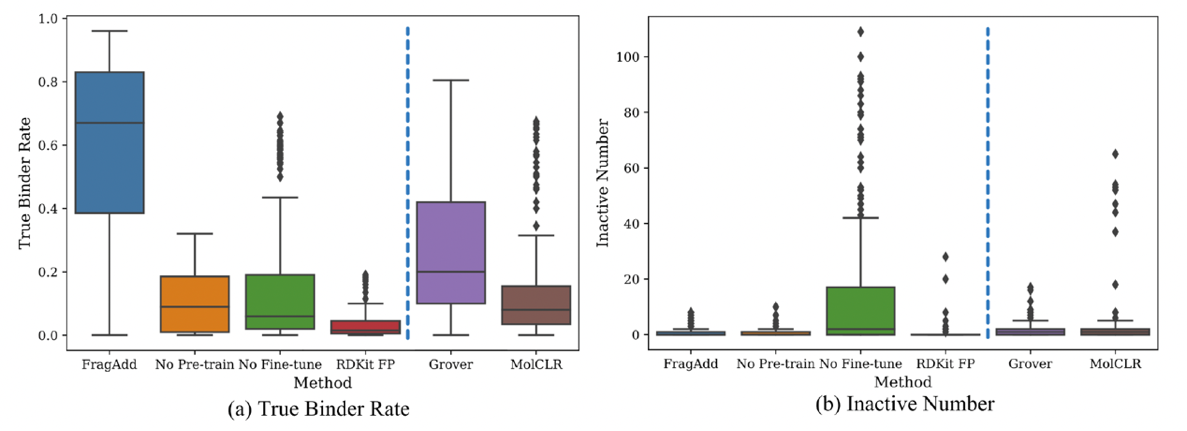 论文将能够解析分子内在基本化学原理的深度学习模型应用于药物小分子的虚拟筛选过程,为验证这一策略的有效性,开展了模拟实验,旨在筛选雌激素受体α的抑制剂。如上述图表所示,实验结果表明FragAdd预训练策略显著提高了模型识别潜在药物分子的能力。与传统的分子指纹搜索方法相比,深度学习无需手工设计特征,而是以数据驱动的方式,直接从分子结构中学习有用的信息。此外,深度学习模型能够识别分子结构中那些复杂的模式和非线性关系,这些往往是传统分子指纹难以捕捉到的。基于FragAdd预训练策略,研究团队正积极研发创新的天然产物药物方向,并已进入湿实验验证阶段。