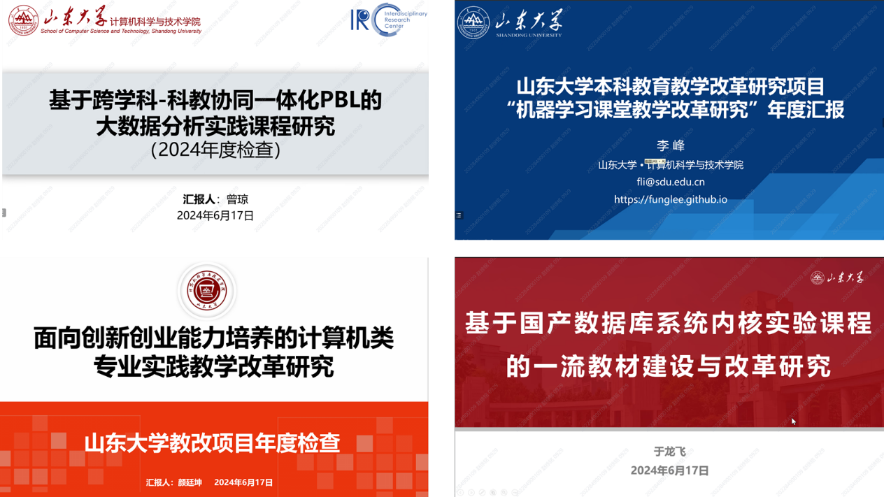 接下来,交流会进行教改项目年度检查汇报,2023年获批的4项校级教改项目负责人曾琼、李峰、颜廷坤、于龙飞分别就项目的研究进展、已取得的阶段性成果、研究过程中存在的问题和解决方案、项目后期建设计划安排及预期成果等情况进行了报告。