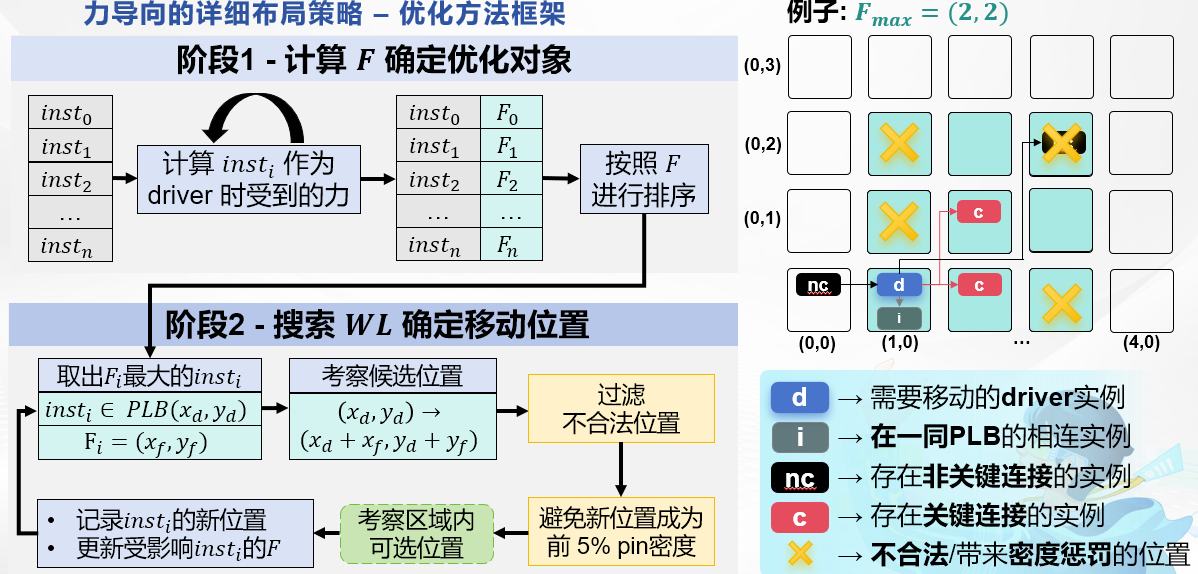 该团队由TapTap体系结构与嵌入式系统研究中心研究生郑汇川、张浩、熊雨晴组成,学院赵梦莹教授和申兆岩教授担任指导教师。团队围绕“FPGA面向布线优化的详细布局”这一赛题,提出了“力导向的详细布局策略”。该策略针对FPGA初步布局后的布线长度再优化问题,在物理逻辑资源映射过程中分别考虑线网漏端对源端的拉力、源端的父线网拉力以及同PLB内实例的反作用力,提出了力的计算方式,为逻辑资源的移动定义了新的搜索方向和区域。在搜索过程中,提出了一种包含合法性和拥塞度的位置评估算法,该算法使用不同比例的关键路径和非关键路径线长和作为衡量,有效减少了映射后的总线长,同时通过动态排序和多线程的方式提升了优化效率。这种策略在满足约束条件的基础上,可以通过细粒度映射有效降低芯片延迟和功耗。
