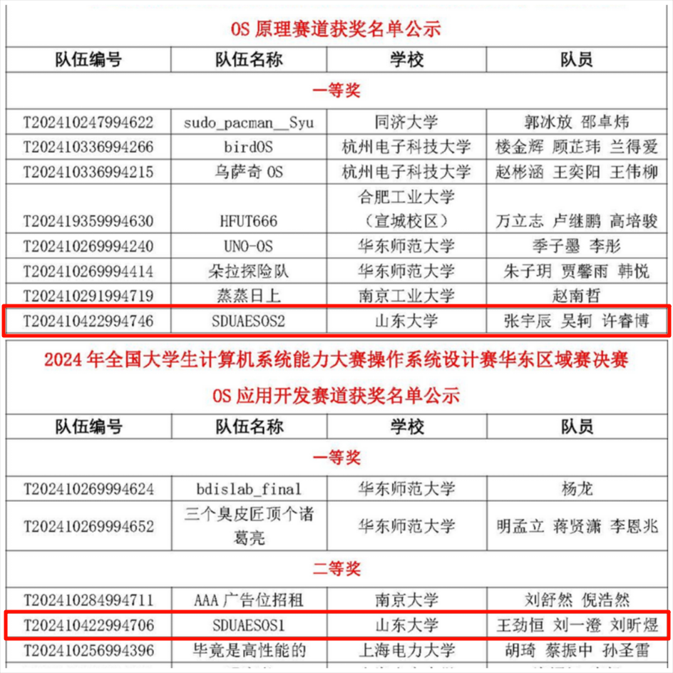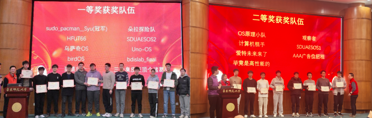 1月12日,全国计算机系统能力大赛操作系统设计赛华东区域赛在华东师范大学普陀校区落下帷幕。自2024年10月25日比赛信息发布后,包括复旦大学、南京大学、中国科学技术大学、同济大学和厦门大学等300余支参赛队伍进行了激烈的角逐,有135支队伍入围决赛。决赛以“成果展示+答辩”模式进行,一等奖占全部决赛队伍的7.5%,二等奖占比为16.5%,三等奖占比为27.1%。最终,来自山东大学TapTap体系结构与嵌入式系统研究中心的团队SDUAESOS2获得一等奖,团队成员由本科三年级学生张宇辰、许睿博、吴轲组成,团队SDUAESOS1获得二等奖,团队成员由本科三年级和二年级学生刘一澄、王劲恒、刘昕煜组成,两支队伍的指导老师为贾振格教授。