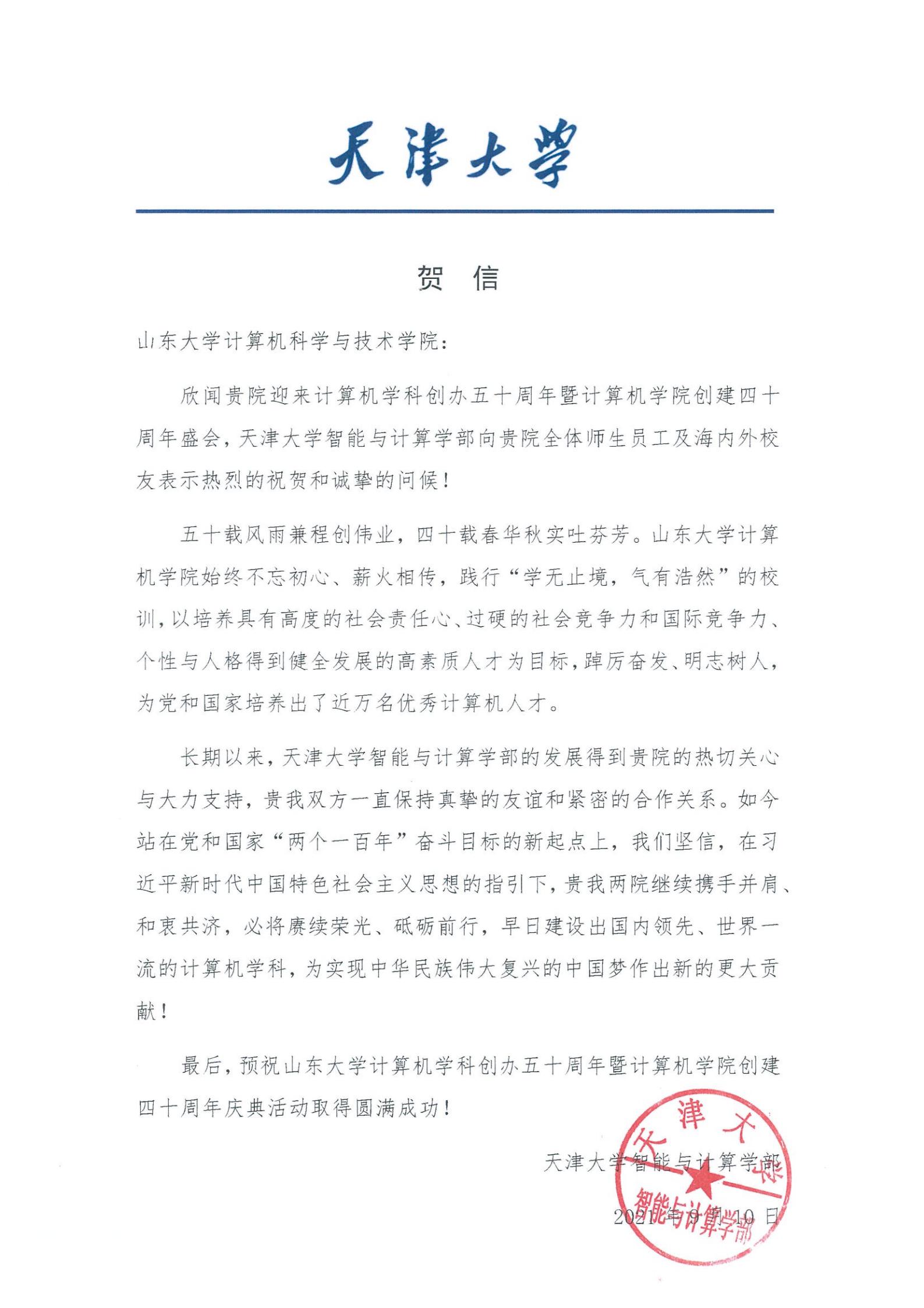 天津大学智能与计算学院贺信